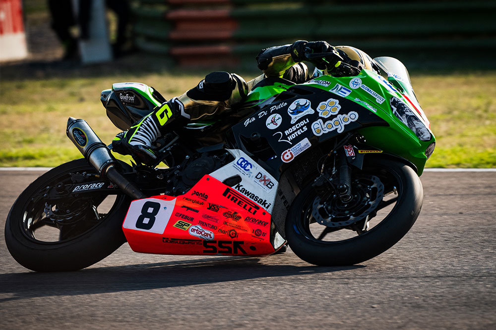 Nella terra dei Motori, sullo storico tracciato di Imola, si è conclusa oggi la prima giornata di gare del sesto round del campionato CIV Supersport300, in cui il Prodina Racing team è impegnato con il talentuoso Bruno Ieraci. In sella alla Ninja preparata dal Prodina Racing Team, il pilota abruzzese ha dimostrato sin da subito una straordinaria competitività. Ieraci ha confermato il suo status di pilota estremamente veloce, assicurandosi un posto nella prima fila grazie alla sua eccellente prestazione, fermando il cronometro sul tempo di 2’05.635.